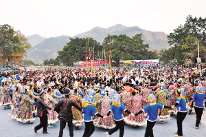 秋收开镰“祭萨”活动中的长桌宴 秋收开镰“祭萨”活动上,当地侗族群众围着篝火踩歌堂 2014年9...