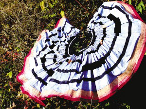 白裤瑶服饰的面料都是老阿婆手摇纺车,把一捆捆棉麻用勤劳智慧的巧手纺织成细纱,合着穗捻成匀称的线。阿妹们再将线绕到线筒上,然后轻涮漂洗,绕到高脚粮仓下。线晾干后进行纺织,一块块自纺的棉纱土布就形成了,之后就可以在这块布上尽情“作画”了。
