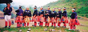 白裤瑶女人体态婀娜。这婀娜既来自于她们风摆杨柳般的百褶裙,也来自身上前后两片的夏衣。夏衣,黑色的调子,没领,没袖,前面是一块和肩膀宽度相等的正方形素布,后面则是用蚕丝布来制作的裙边土布,上面绘满了蜡染和花绣图案。用浆染土布缝制成的百褶裙上,布满了手绘而成的彩色图案。其最复杂的工序,一是借粘膏树汁凭空勾画,二是用花线依着粘膏树汁描过的隐约印痕,一点一点地挑绣出彩色图纹来。做好一条裙子,往往需要花上女人们半年的时间。
