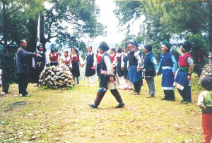 节日一大早,各家各户便到供奉药仙的树林中,环药仙的化身——一堆奇石或一棵古树歌舞、供祭。随后,人们各自相约成组,背篮荷锄,唱着《采药歌》,游山采药。若遇到要采、挖的植物,小组中年岁最长的人,会在其根部先挖一锄,然后停锄唱起《盘歌》:这是一兜草,它叫什么草?用它治啥病?药功好不好?随之,挖药者便从小到大,一人回唱一句作答:草名金钱草,采来加工变成宝,味苦、性凉用处多,肝病、尿阻少不了……之后,方采挖这棵药草。