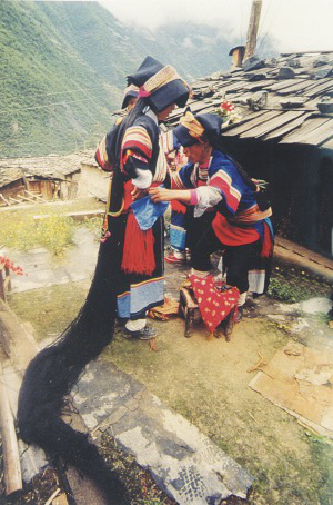 用纯黑牛毛线续接编成的300余根辫子,长达4米,犹如黑色的瀑布