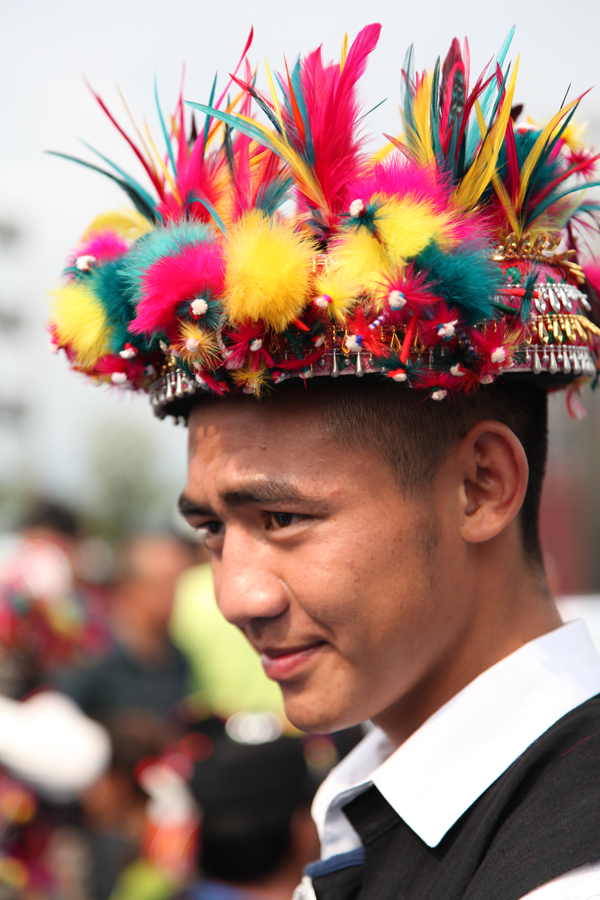7.切弟支系。哈尼族切弟支系妇女服饰从头到脚可分为四个部分:“无巴”、“马牙” (帽子、包头巾)、“帕洪、帕得”(衣裳、围腰)和“帕苦” (腰带)。切弟妇女头部包青布头巾,包扎后套上一根钉满银泡的彩带,彩带两端缀有六束用毛线结成的彩穗。身穿薄布紧身裳,外套青色左衽马甲,马甲腰部钉有三角形银泡图案若干块。