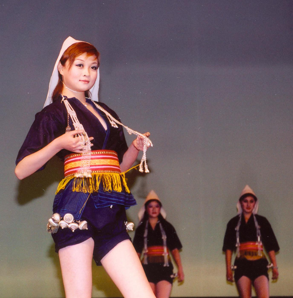 3.布都支系。哈尼族布都支系妇女服装用黑色自染布料作上衣,齐膝短裤和绑腿带。包头布端都镶有一块精美的刺绣图案,衣服领口处多配有银饰坠,腰束一条长丈余的腰带。