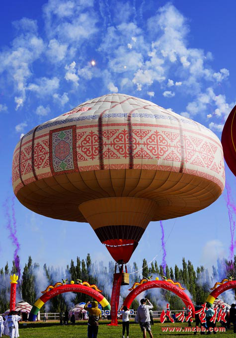 毡房是哈萨克族的传统民居之一,是哈萨克族人游牧时居住的地方。图中直径长达21米、高23米、体积达2800立方米、通过世界纪录协会认证的这只阿克塞县的旅游空中形象大使,是目前世上最大的哈萨克族毡房热气球