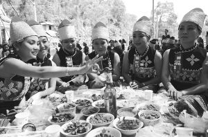 “鸟头节”是花腰傣的传统节日,村民们通过传统的祭祀方式,祈求神鸟保佑村寨平安吉祥,来年五谷丰登。现在“鸟头节”已注入了轻松、欢快的内容。宴席上,大家将鸟头用木棍插好放在酒瓶中,轮流弹动鸟头,鸟嘴指向谁,表示谁的运气好,就要喝下一杯酒。这样饱含祝福、喜庆的劝酒习俗,为节日增添了乐趣。图为花腰傣姑娘们弹动鸟头喝酒。