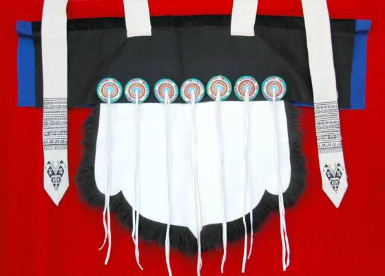 七星披肩所用材料为黑色绵羊皮,先将羊皮去毛、洗净、硝白、缝成披肩,然后在披肩背上绣上自己缝制精美的七颗星星,每个星星中心垂下两条布带,整个布带与白色宽带相绕,带梢端垂于后,披肩的两角钉上两条白布带,劳动时拉到胸前交叉系紧。”这样一件精美的“披星戴月衣”是对勤劳的纳西族妇女的歌颂,形如蛙身状的披肩是古代纳西族图腾崇拜的标志,在纳西族传统中,青蛙是智慧之神,反映了纳西族在美学、习俗等方面形成的传统观念和心理特征。