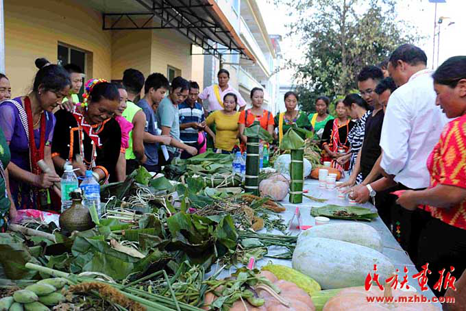 尚立文向记者介绍说:“以前景颇族过年,大年三十,一部分男人在家杀年猪,其余的就上山打猎。景颇族很慷慨,凡是获取到的猎物,见者都有份。女人除了在家准备年夜饭,也会上山或下坝子采野菜等。但不管是打猎的还是摘野菜的,都必须在太阳落山前到家,阖家欢度春节吃年夜饭。现在生活好了,不打猎不摘野菜了,但还是得遵循太阳落山之前到家的习俗。”