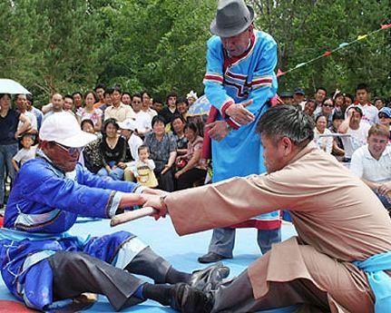 “扳棍”也是达斡尔族的一项传统体育竞赛。据说,扳棍的形成已经有近千年的历史,由于扳棍比赛对场地、器材的要求极低,因此在达斡尔族的传统节日如阿涅节或抹黑节上,都会看到达斡尔人在举行扳棍这场体育比赛。