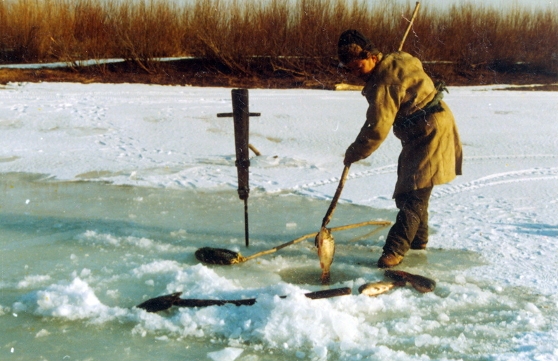 冬季凿冰叉鱼的达斡尔族(刘军摄)