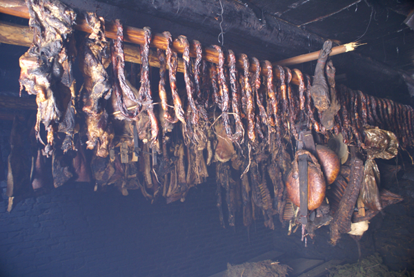 羌族通常一年宰杀一次猪,所以除了刚刚宰杀的那几天能吃到鲜肉外,平时很少食用。每年冬月杀猪后均将猪肉切割、抹盐、烟熏,腌制成腊肉。猪油也在抹盐后,用两个木夹夹压成饼状,随吃随炼。同时也取部分瘦肉切碎,拌上作料,灌入洗净的猪小肠内制成香肠。羌族还常把新鲜的猪骨头砍成小块,然后抹上盐、花椒、姜、蒜、葱等,放进猪的胃囊里,扎紧、风干,挂在火塘上用烟熏,制成猪肚骨头,久存不坏。