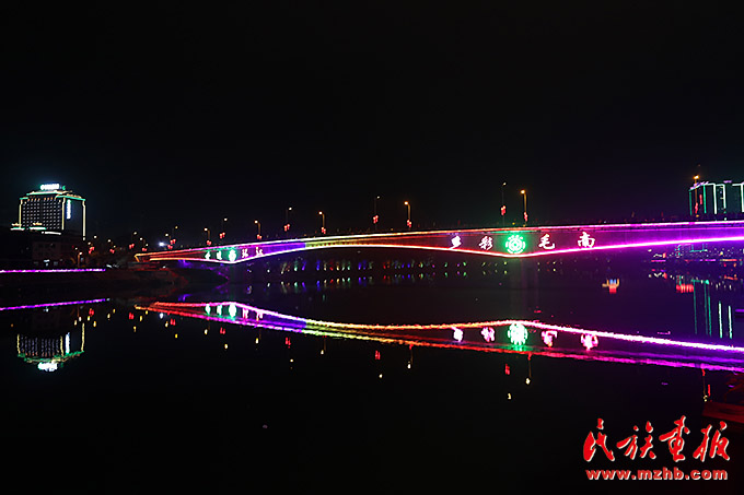 11月9日通车的环江三桥不仅便利了交通,桥上的霓虹灯把夜色中的毛南山乡装点地非常美丽
