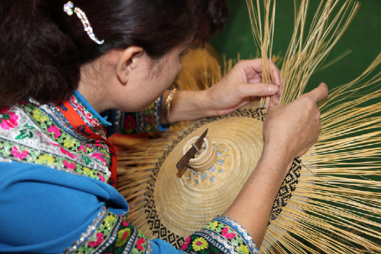 三角钩锄是毛南族特有的生产工具,毛南语叫“拱”。它小巧轻便,适合在鸡窝地里中耕锄草,又用于点种黄豆。种黄豆还有一种木制的“点穴锤”,用8寸到1尺长的金刚木削成圆杆,形如擀面杖,中间插一木柄,手握木柄在泥土里一锤,就成一个如鸡蛋形的坑,即可放入黄豆,盖上草木灰。这种“点穴锤”一锤一穴,工效很高,是种黄豆的最佳农具。此外还有禾剪、割烟刀等(图为毛南族织锦)。
