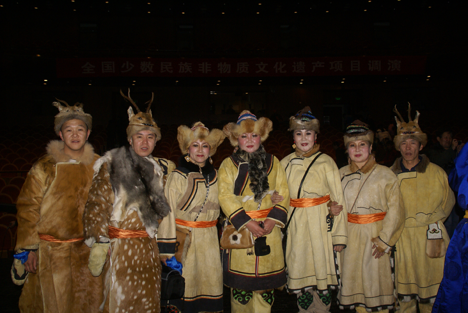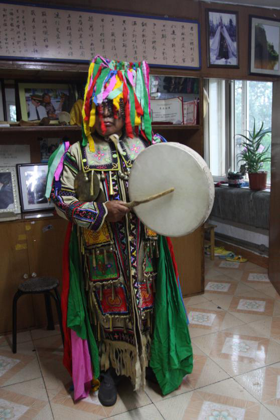 冬天穿的鞋是“奇哈密”和“温得”,“奇哈密”是用狍脖皮或犴皮做靴底,用狍腿皮拼缝成靿的短靴。“温得”是用鹿或犴皮做底,鹿或犴腿皮拼缝成靿的长靴。“温得”因为靿高,冬天穿着打猎不易灌雪。这两种靴子都要用冬季绒毛狍皮做成的袜子配套穿用,暖和跟脚,踩在雪地上没有声响。夏天一般穿“奥劳其”,是一种皮底布靿短靴。“考呼落”,是用冬季绒毛狍皮缝制的二指手套,掌面腕部留一缝口,手从缝口中伸出,手套仍护在手背上,既使在零下40度的严寒中处理猎物,也不用担心手被冻坏。还有一种五指狍皮手套,背面正中绣花、蝶等中心图案,五指的关节和指甲处绣出各种小型图案,然后用连理枝将中心图案和关节、指甲图案连为一体,中心图案代表手掌,手指图案代表关节和指甲,连理枝代表骨骼和血脉(图为越来越鲜见的萨满服饰,吴雅芝供图)。
