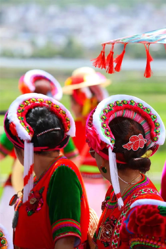 在白族女子的包头头饰上,蕴含着一个大家非常熟悉的词语:风花雪月。垂下的缨穗象征下关的风,艳丽的花饰象征上关的花,帽顶的洁白是苍山雪,弯弯的造型是洱海月,足见白族群众的精巧灵思。