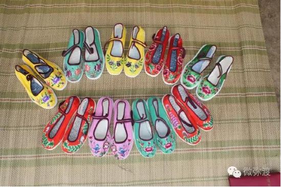 绣花鞋分大口鞋、小口鞋两种。大口鞋大方素雅,小口鞋古朴艳丽。花样有“峰赶梅”、“喜鹊登枝”、“狮子滚雪球“、“凤穿牡丹”和彝族人民结婚时候,按当地风俗所需必须穿的“毛边底”等。这些花样图案具有不为时代变幻所动的恒久性质,蕴藏着浓厚的传统民俗文化。它给予人们的绝不仅仅是绚丽悦目的美感,还是彝民们征服自然,繁衍生息,争取爱情和欢乐的记录。