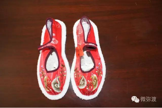 而现存的娃娃服饰有聪明鞋、虎头帽。其中,以聪明鞋较为常见。孩子满周岁时,母亲总会给孩子准备一双绣有葱苗和花朵的“聪明鞋”。据传,穿过聪明鞋的孩子会更加聪明伶俐,并像葱苗一样快快长大。在娃娃服饰中,配饰有项圈、百家锁、手锣、脚链、扣饰、帽饰等,多系银器所制。帽饰也有用玉器者,其形状多为玉罗汉、玉观音等小件。