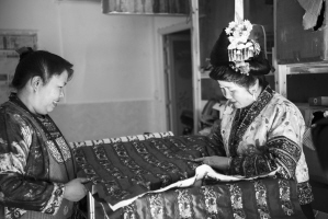 韦祖英(右)在向姐妹传授苗绣技艺。