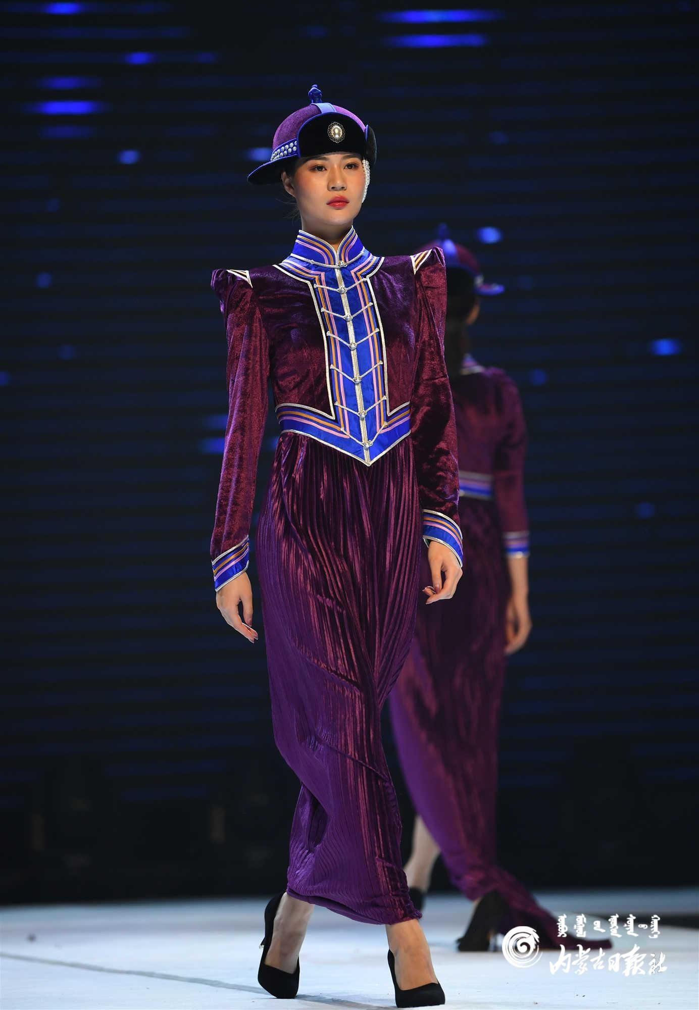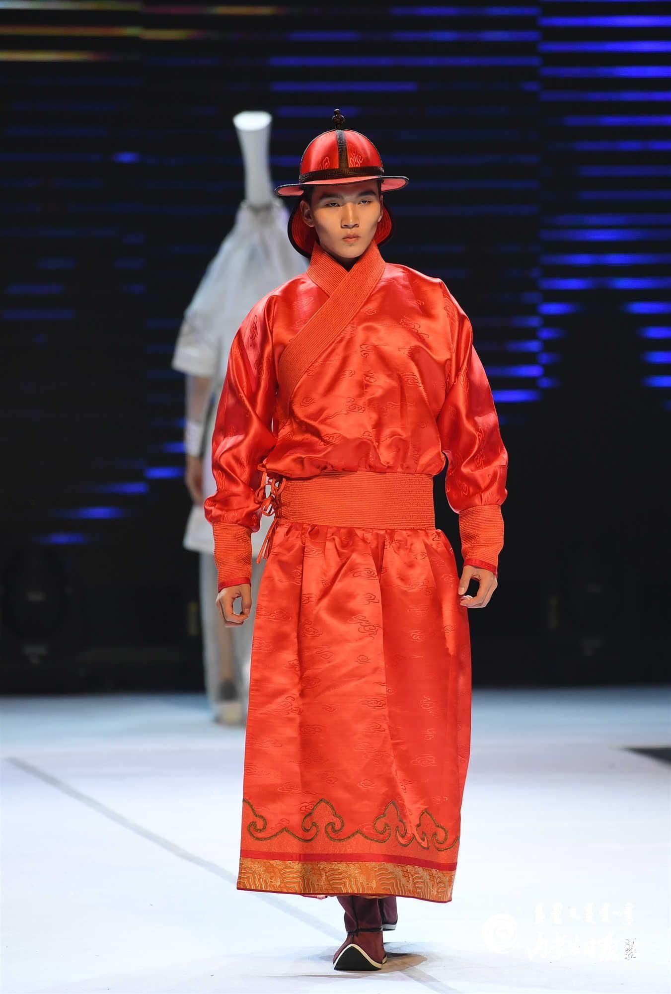内蒙古艺术学院的学生在舞台上展示蒙古族礼服。