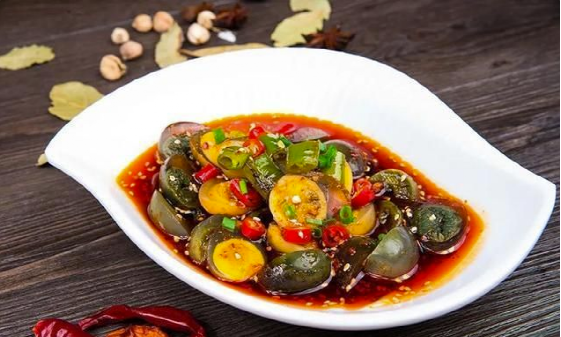 第二就是松花皮蛋。它是用新鲜鸭蛋加工腌制而成的一种生吃食品,因为经过了腌制加工,所以蛋清和蛋黄凝固静皮,剥开不粘蛋壳,且富有弹性,所以简称为“皮蛋”。