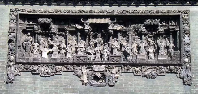 较之北方砖雕的粗扩、浑厚,广东砖雕显出纤巧、玲拢的特点,采用精制水磨青砖为材料,往往雕镂得精细如丝.习惯称之为“挂线砖雕”。雕刻手法多以阴刻、浅浮雕、高浮雕、透雕穿插进行,精细者可达七八层,造成景致深远的效果,雕成的花卉枝叶繁茂,形如锦绣。戏曲人物衣甲清晰。在不同时辰日光照射之下,还能呈现出黑、白、青灰等不同色泽,高光部更烟烟生辉,画面富于起伏变化。