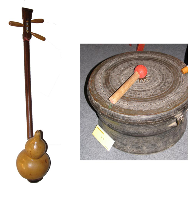 毛南族的歌舞比较简单,乐器也不多,主要伴奏乐器有长鼓(也叫黄泥鼓、祥鼓)、木鼓、手鼓、铓锣、小铜锣,另外有时还用到钹、木鱼和碰铃,古时还用唢呐、箫、笛等(左图为毛南族葫芦琴)。