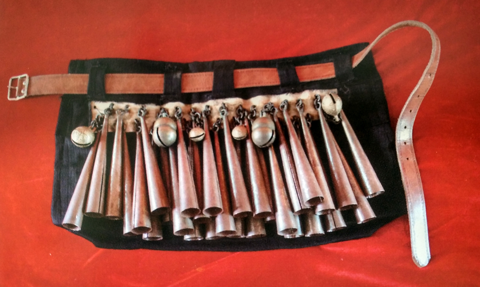 牛角,用黄牛犄角制成,音色浑厚悠扬,最初是狩猎时的进攻信号,后曾广泛用于战场。