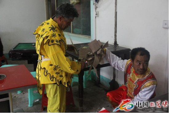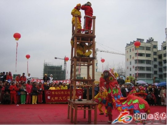 高台是用5至7张八仙桌一层层叠垒,最上面的桌子四腿朝天,总高度近8米。四人登台表演。两个人扮狮子,把狮头狮皮披在身上,只露双脚;另外两人分别装扮成孙悟空和笑脸和尚挥舞手帕,大蒲扇逗引狮子逐层攀上高台,为了稳固,安全起见,每张桌子的四角都用草纸叠浸水后垫着防滑,做到万无一失。