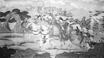 《文成公主进藏》及其细部。规格:100厘米×60厘米,创作时间:1985-1993年,作者:夏吾才郎、更登达吉。这幅作品由夏吾才郎构图,更登达吉及徒弟上色完成。整幅作品生动写实、布局严谨、色彩淡雅、远近相应,呈现出广泛的视觉空间。 解加馨于供图