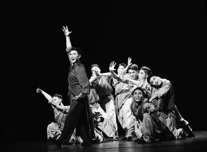 作品第二段,山东快书表演渐入佳境,“观众”从围观转变成围坐在说书人身旁听故事,一“立”一“坐”,巧妙地呈现舞蹈的层次,也体现出说书剧情的层层深入,步步递进。在这段表演中,说书人与“观众”亲密互动,语言与动作交相呼应,展现出快书与舞蹈相结合的编创思路。此段说书内容着重介绍了“山东好汉武二郎”,说书人说罢,“武松”出现在“观众”眼前。这段舞蹈对比强烈,既有“武松”表演时独舞形象的“动”和“观众”看戏时群舞形象的“静”的对比,也有叠罗汉高空造型和低空舞动的对比,还有无序奔跑的散点构图和有序方队的不断紧缩的画面对比,这些都是为了后续说书内容的高潮迭起营造氛围。