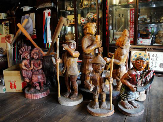 雕刻。高山族的雕刻以木雕和石雕为主,金属雕刻是现代才出现的。排湾和鲁凯两个族群的雕刻工艺最为发达,也最具特色。木板雕刻的纹样与石壁雕刻大致相似,只是木板雕刻多施色彩,少则红、白两种色,多则加上黄、橙、蓝、绿色不等,鲜艳亮丽,引人注目。一般住屋内外都有雕刻,贵族的住屋装饰尤其突出。立柱和壁板雕刻的主题多为叙述家族神话、传说起源或表彰家族的特殊事迹。雕刻的题材以神话传说、狩猎生活、祖灵像为主;木雕以人像、人头、蛇纹、野猪和鹿纹为主;其他还有重圆纹、太阳纹、网形、风车形,四叶形、人体生殖器等等。这些题材与排湾人的原始宗教、神话内容有密切的关联。住屋的木雕取材于质地坚硬的樟木、台湾榉、二叶松等乔木,而木桶、木臼、木椅等器物,除了坚硬木材外,也选择樟木,乌心石等。至于木匙、烟斗、木梳则喜欢用月橘之类的材质。