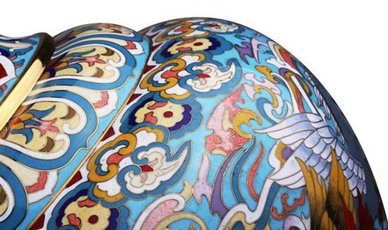 此时的景泰蓝不仅继承了明代豪华、古典、雅致的民族风格,而且镀金技术更为发达,器物表面多饰以珍贵宝石,镀金厚重光亮,宝石灿烂夺目,二者相得益彰,充分体现了皇家的雍容气派。