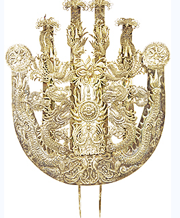 而最为极致的演绎,则要属黔东南地区的苗族“盛饰”:黄平苗族的球形银凤冠,银冠之上布满银花,蝴蝶、螳螂、雀鸟等动物形象立于花间,一派生机。银冠下缘饰有响铃,行动时摇曳生姿、声色俱美;雷山西江苗族的大银角,宽近1米,立高可达70厘米左右,面上錾刻有双龙抢宝的主纹,两端尖角处可插羽毛或彩线,中央插有一把银扇,既像鸟羽,又似太阳放射出的光芒……