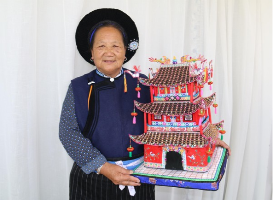 近年来,鹤庆县高度重视民间文化遗产保护工作,甸南族刺绣作为民间特色文化遗产之一,得到较好的保护和传承。近日,金墩乡银河村上曲江自然村71岁的老绣娘赵焕珍,经过多次实地观摩,边做边改,边构思边计算,以绣花、梳花、牵花、飘花、钉花等多种刺绣方法,历时10个多月,把县城的地标性建筑——云鹤楼按比例缩放,创作出了新的刺绣作品“云鹤楼”。