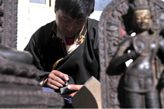 土登加措在雕刻黑玉石佛像(1月8日摄)。