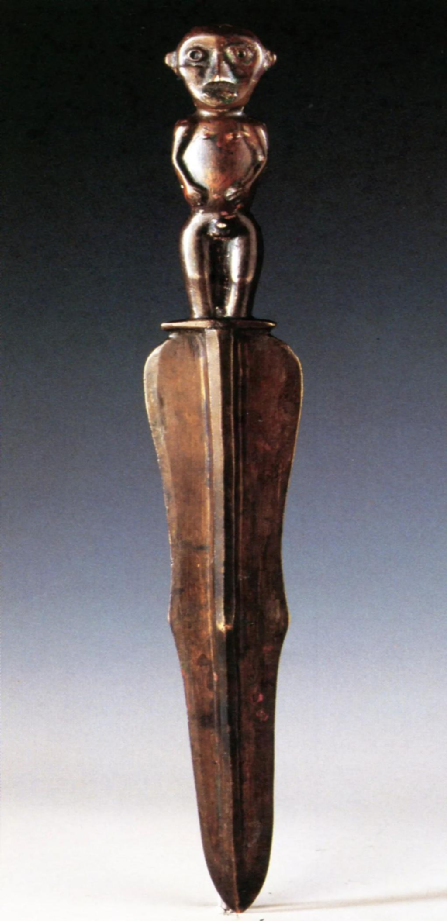 首先是对当地新石器时代文化因素的继承和延续,以男女立人形青铜短剑为例,其圆雕人像造型,是对辽西地区人形雕塑传统的继承。与小河西文化陶塑人头像、兴隆洼文化石雕人像、赵宝沟文化陶塑人头像、红山文化陶塑人像、小河沿文化人形陶壶等一脉相承,虽然人像造型和载体略有不同,但未曾间断,体现了辽西地区史前文明的祖先崇拜和宗教祭祀礼仪传统的延续性。人像造型既是礼制的最高呈现,同时具有标志身份和地位的功能。