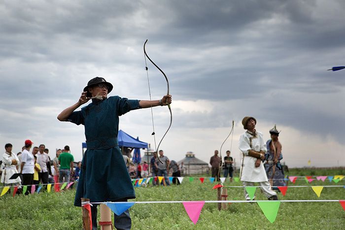 射箭,是蒙古族传统的"男儿三技"的一项目,也是那达慕大会最早的活动内容之一。在800多年以前,蒙古人分为许多不同的部落,他们的经济生活大体可分为游牧经济和狩猎经济两种。在成吉思汗统一蒙古以后,虽然狩猎经济的部落逐渐转向了游牧经济,但狩猎时期长年积累下的拉弓射箭的本领却保留了下来,以防外敌侵略和野兽袭击畜群。没有牲畜的贫苦牧民则仍依赖弓箭捕杀动物维持生活。