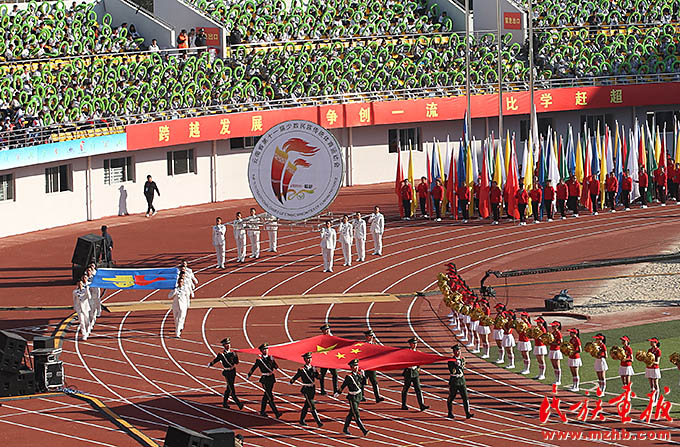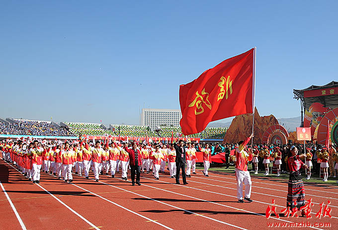在国旗、会旗、会徽和彩旗方阵的引领下,来自全省16个州市、云南民族大学和云南师范大学的18个代表团按顺序依次入场,每个代表团都献上了别具特色的民族歌舞表演,整个入场式载歌载舞,气氛欢快热烈。在雄壮的国歌声中,中华人民共和国国旗和云南省少数民族传统体育运动会会旗先后冉冉升起,飘扬在世界佤乡、大美临沧的蓝天下。
