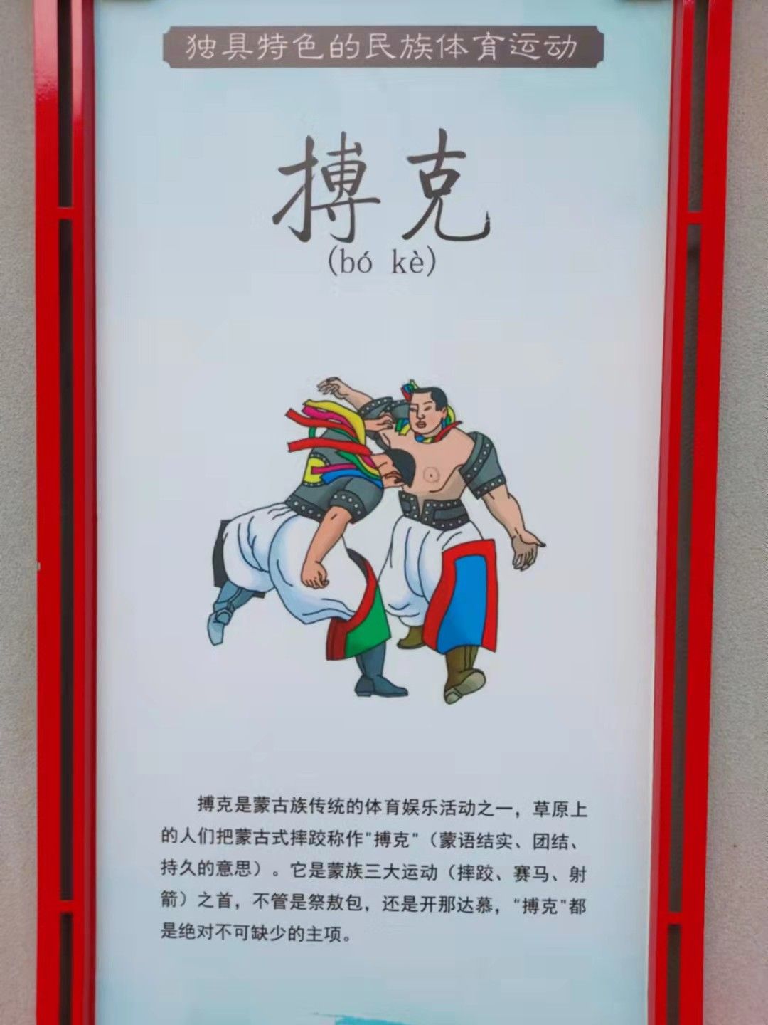 搏克是蒙古族传统的体育娱乐活动之一,草原上的人们把蒙古式摔跤称作"搏克”(蒙语结实、团结、持久的意思) .它是蒙族三大运动(摔跤、赛马、射箭)之首,不管是祭敖包,还是开那达慕,"搏克"都是绝对不可缺少的主项。
