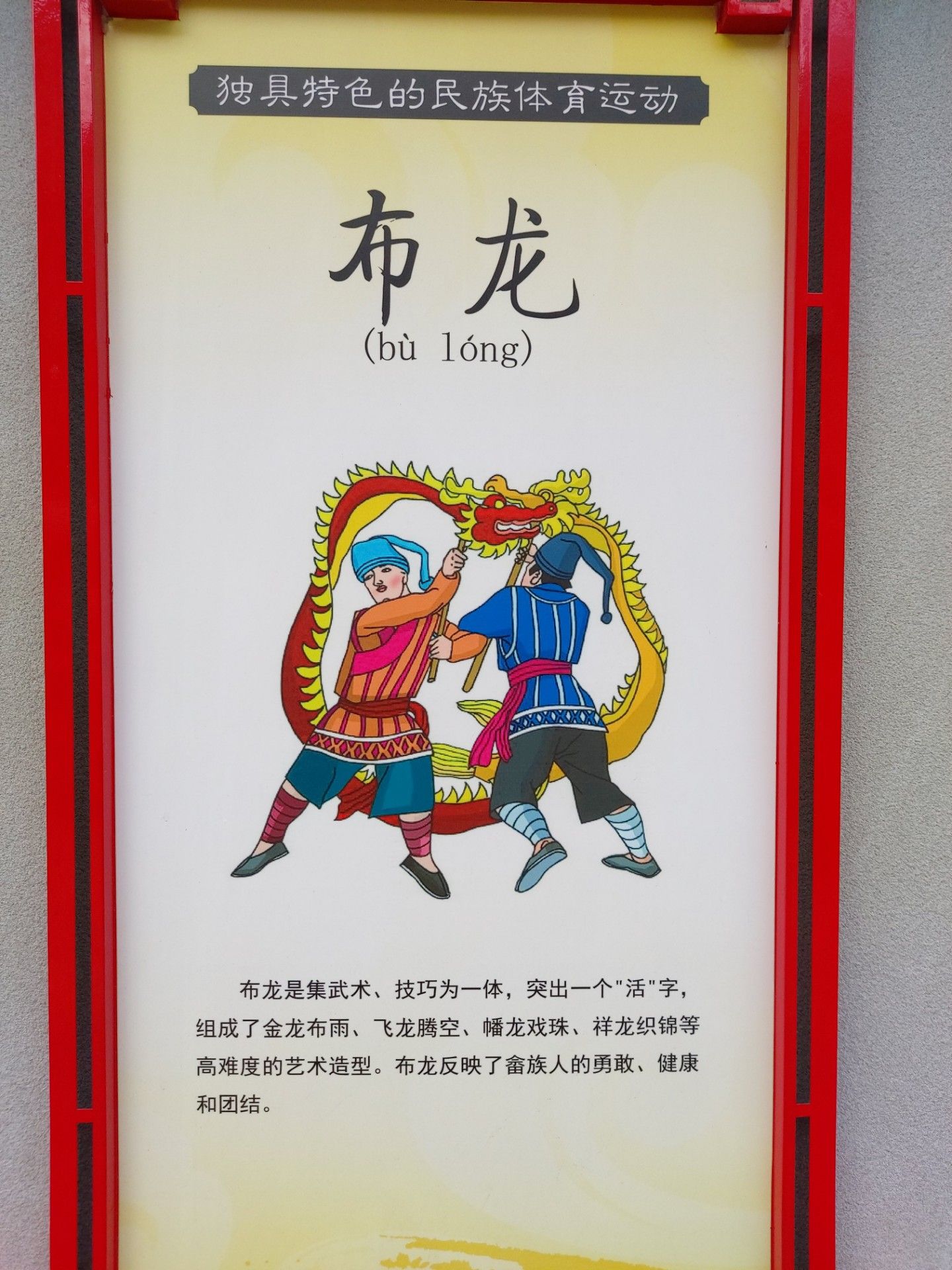 布龙是集武术、技巧为一体,突出一一个"活"字,组成了金龙布雨、飞龙腾空、幡龙戏珠、祥龙织锦等高难度的艺术造型。布龙反映了畲族人的勇敢、健康和团结。