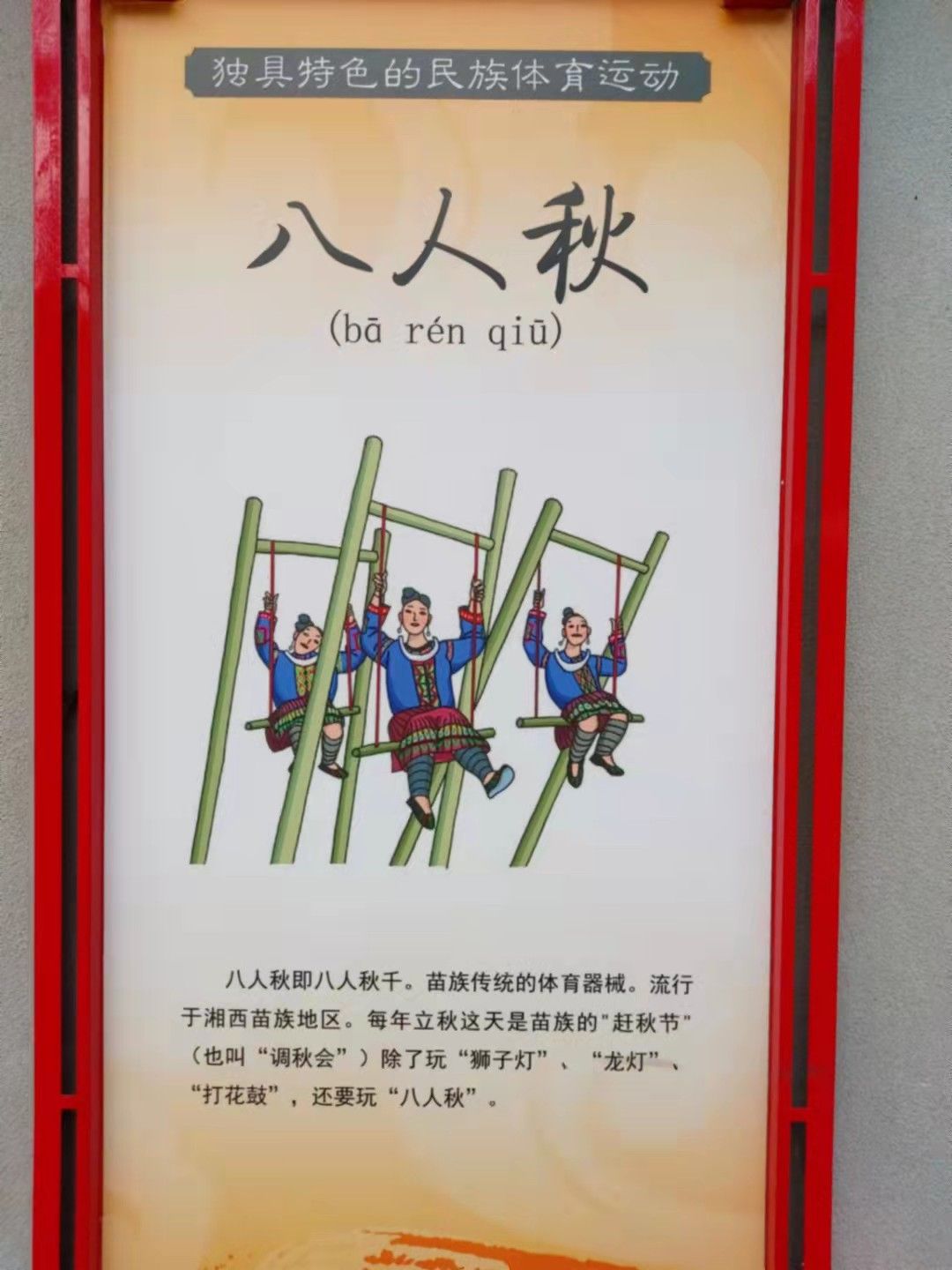 八人秋即八人秋千。苗族传统的体育器械。流行于湘西苗族地区。每年立秋这天是苗族的“赶秋节”(也叫“调秋会”)除了玩“狮子灯”、“龙灯”“打花鼓”,还要玩“八人秋”。