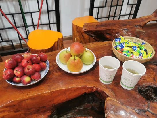 刚踏进传习所,就见何松康老师已准备好茶水以及时下最新鲜的花红、梨子等水果候着我们到来了。对于每一位来到传习所了解白族霸王鞭文化的访客,她都热忱相待。