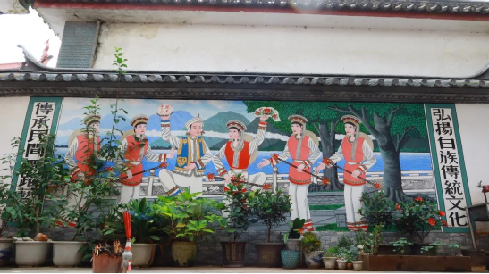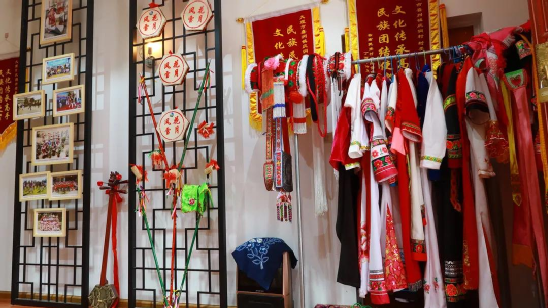 方正的堂屋里挂满了何松康参加演出、培训的各种照片及霸王鞭、八角鼓、服装等演出道具。院子的墙上专门请人绘了一幅霸王鞭的彩绘,旁边书写:“弘扬白族传统文化,传承民间舞蹈艺术”。