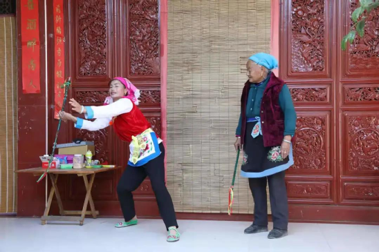 何松康,白族霸王鞭州级代表性传承人,也是白族霸王鞭传习所的负责人,传习所就建在她们家一楼的堂屋里。