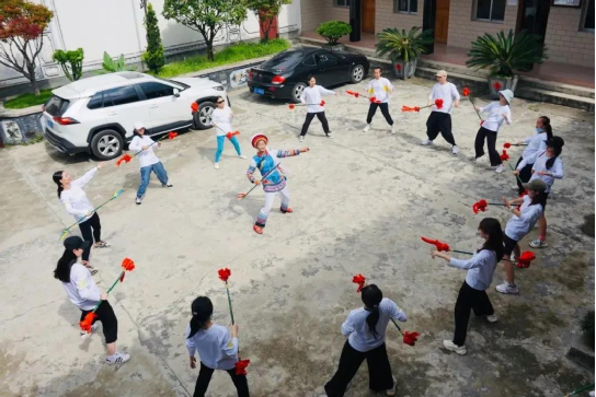 在时间不冲突的情况下,每天下午的三点至五点何松康都会到庆洞完小教同学们打霸王鞭,身体力行传承人“非遗进校园”的职责。此外,百川中学、银桥中学等周边学校都留下了何松康教霸王鞭的身影,“非遗传承要从娃娃抓起”,这句话,她一直在践行。