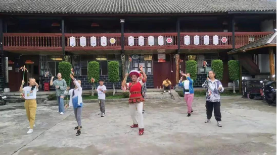 作为传习所的负责人,何松康不仅在传习所里教大家霸王鞭,一有空她就带上霸王鞭,穿上传统的劳作服饰走出去,给更多的人教学。