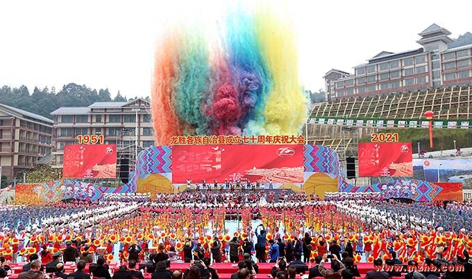 各民族同胞身着盛装、欢聚一堂,通过民族风情展示、龙狮展演、文艺表演、跳民族团结舞等活动欢庆县庆,展示了龙胜民族团结进步事业全新风貌与经济社会发展成果,各族人民脱贫致富的幸福感,以及各民族亲如一家、共同团结奋斗、共同繁荣发展的新气象。