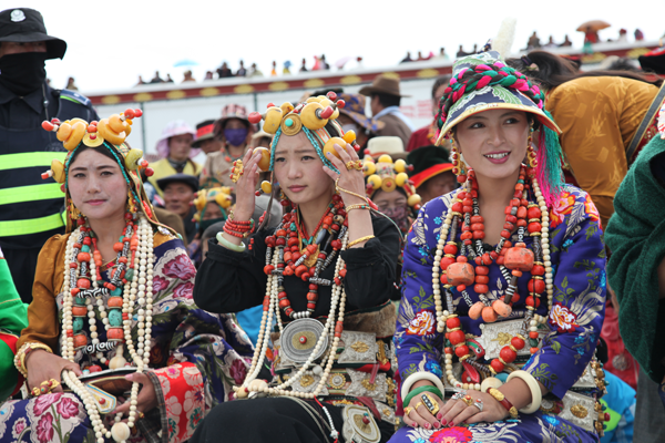 甘、青、川的藏族男子非常讲究腰饰,有财力的男子一般都有一条镶有仅、银、玉的宽皮腰带,腰带上还挂有装饰性的小刀、火镰等。青海玉树地区的妇女装追求华丽,内衣外袍色彩艳丽,绸缎腰带留长飘带,头、颈、发、腕、指和腰佩有金、银、玉、珊瑚、玛瑙等珍贵饰品,一套豪华女装价格不菲。因此有谚语:“男人的财富系在腰上,女人的嫁妆穿在身上”之说。云南藏区的女装上身穿长袖彩绸衫,外着无袖大襟长袍,长袍领口、襟边和下摆镶有锦缎,色彩艳丽。云南一些藏区的女子喜欢穿百褶裙,显示出女性的优美身材。西藏工布地区的女装显得简约,先穿有袖内衣,再将氆氇拚缝成大片,中间挖一圆口,穿时将头伸进圆口两端垂与胸背,再束腰带即可。藏族妇女的头饰也很多,有碎辫的、有戴头巾的,有盘发的,西藏山南地区的巴珠最有特点。巴珠是三枝状,平系于头顶两枝向前,将分梳的两条发辫分别盘于两枝上。其上部还有一弓形物,与三枝状两端连接,上系丝织品,边缘镶珍珠、珊瑚等。女子13岁戴巴珠,象征已经成人。金边帽也很有特色,藏区的男女都戴。帽型为桶状,周边镶织锦,内有四片耳片,两大两小,天冷时放下耳片护耳。狐皮帽形似倒挂的金钟花,以布作底层,再缝上狐狸皮,帽后有两条长飘带。男帽稍高,女帽较低。