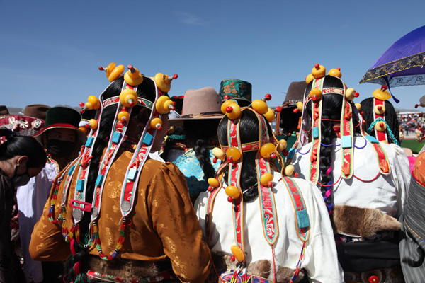 藏族妇女发饰因地域之别而显得丰富多彩。西藏部分地方的妇女喜戴巴珠,拉萨附近的妇女所戴三角形巴珠,平系与头顶,两枝向前,将分梳的两条发辫分别盘在两枝上。日喀则、江孜一带的妇女戴弓形巴珠,弓背向上,梳成多条的发辫分别挂在弓的两端。贵重的巴珠上面镶有珊瑚、玛瑙等,显得富丽堂皇。姑娘一戴巴珠,就意为着长大成人,因此,第一次戴巴珠时,家中要为姑娘举行传统的成人仪式。