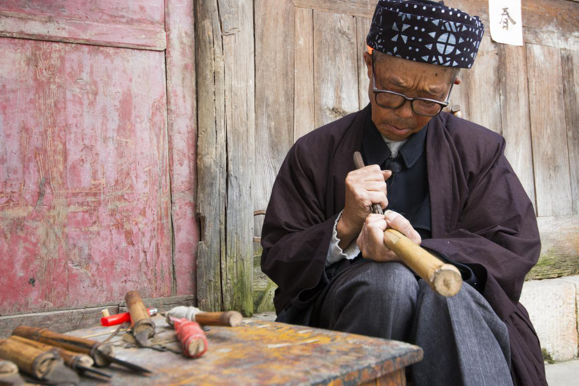 作为苗族最著名的芦笙,其制作工艺较为复杂,而批林村的罗朝贵老人是高坡远近闻名的芦笙制作师,也是省级文化传承人。作为传承人,罗朝贵老人不仅对芦笙文化了解颇深,他对于批林村的服饰、刺绣等都有深入的了解。作为芦笙制作师,他与批林村其他村民略有不同,主要体现在其衣饰上。其衣饰为褐色,头饰则是用绣有图案蓝布围绕。作为芦笙制作的大师,罗朝贵老人对于芦笙非常热爱,在平时自己也会拿出芦笙,一个人跳起芦笙舞。78岁的他,步伐依旧矫健,眉目神色间,依稀能看见年少时的鲜衣怒马。