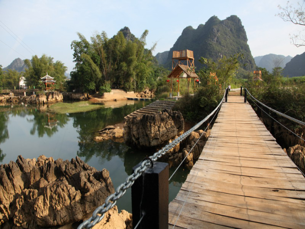 【水资源】 都安地表河流属珠江流域西江水系。集雨面积在20平方公里以上的河流共10条,其中正常流量大于25立方米每秒的有红水河、刁江、澄江三条河流。全县地下河系有25条,干支流共80条(其中支流55条),主流总长为445.2公里,集水面积388l平方公里,最大总流量大于921.9立方米/秒,最枯总流量为14.273立方米/秒,年径总流量36.10亿立方米。枯水期流量大于1立方米每秒的地下河有地苏、中旧、下里、王岐、帮祖、大兴6条,流程10公里以上的地下河有地苏、帮祖、大兴、拉楞、中旧、下作、下里、带河、何家、岜马、永仁、牛角、九楞、王岐、九渡、拉烈等17条。其中地苏地下河系为广西最大的地下河系之一。水能资源丰富。全县水能蕴藏量为4万千瓦(不含红水河和地下河),可开发量为1.68万千瓦,占理论蕴藏量的42%;全县已开发1.06万千瓦,占可开发量的63.1%(图为地苏瑶台景区一角)。